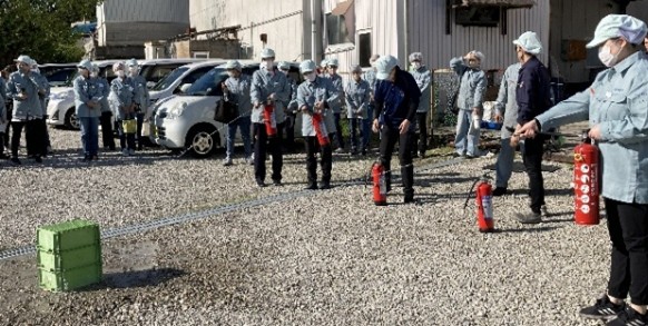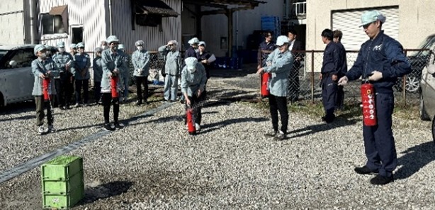 2025年10月23日(木)、プラネット大阪工場にて工場内より出火を想定した避難訓練を実施しました!社員、パートさん、その日の派遣さんを含めて、全員参加で行いました👭非常ベルが鳴ると、避難指示に従い避難場所である駐車場へ速やかに避難。避難後は点呼をして、全員の無事を確認しました。 その後は、消火器の使用練習を実施🧯🔥火元を想定した緑のコンテナに向けて、水の入った消火器を使った消化訓練を行いました。